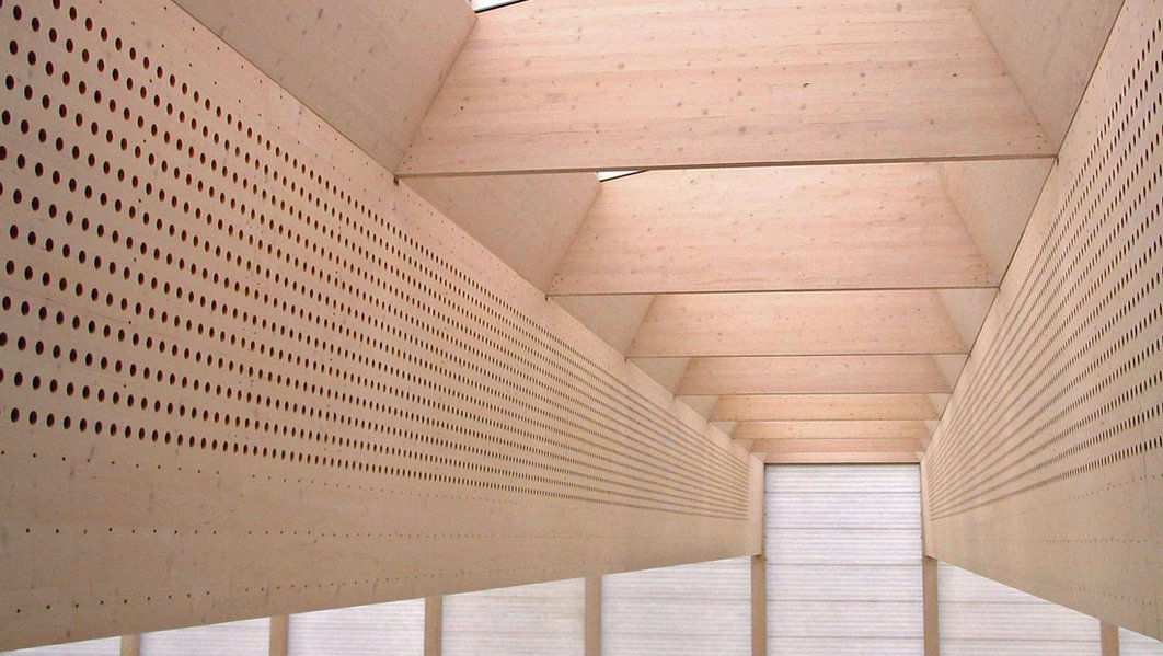 Dreigeschossiger, 87 m langer Klassentrakt mit nordseitig angedockter Turnhalle im Untergeschoss. Tragstruktur: vorgefertigte, tragende Wandelemente und Stützen; Decken aus vorgefertigten, vorgespannten Sichtbetonplatten mit Überbeton. Foyer, Singsaal und Decke Turnhalle in Ingenieurholzbau.