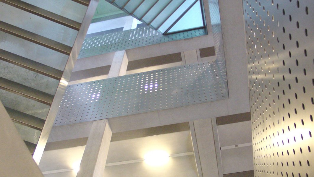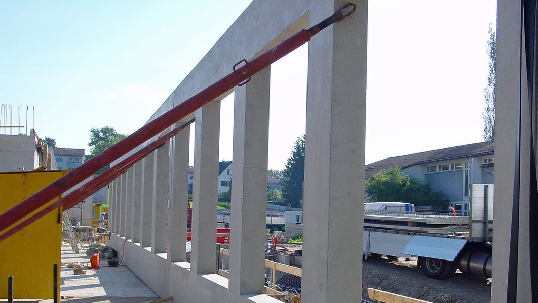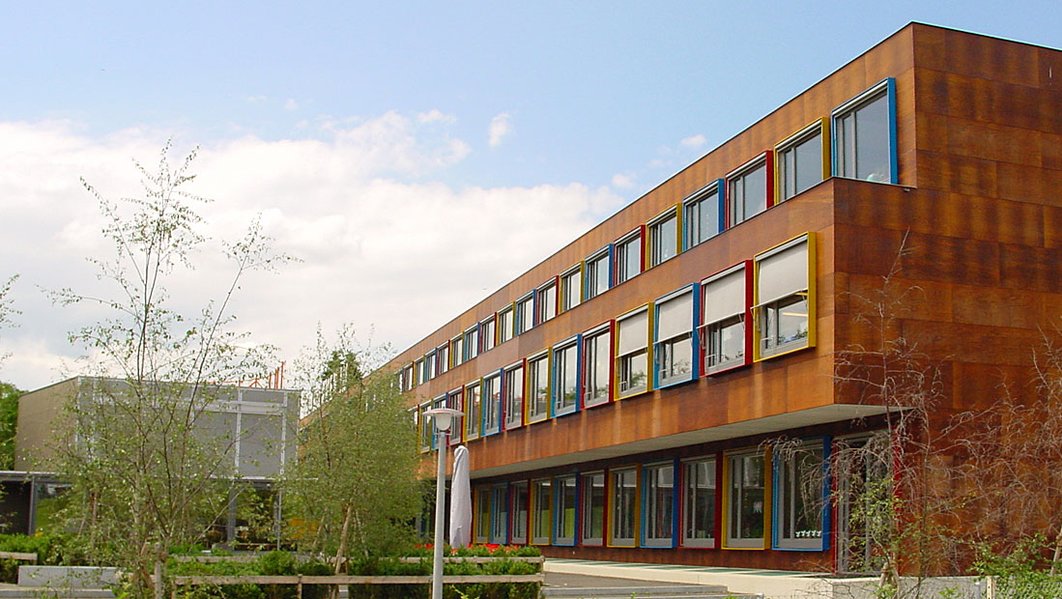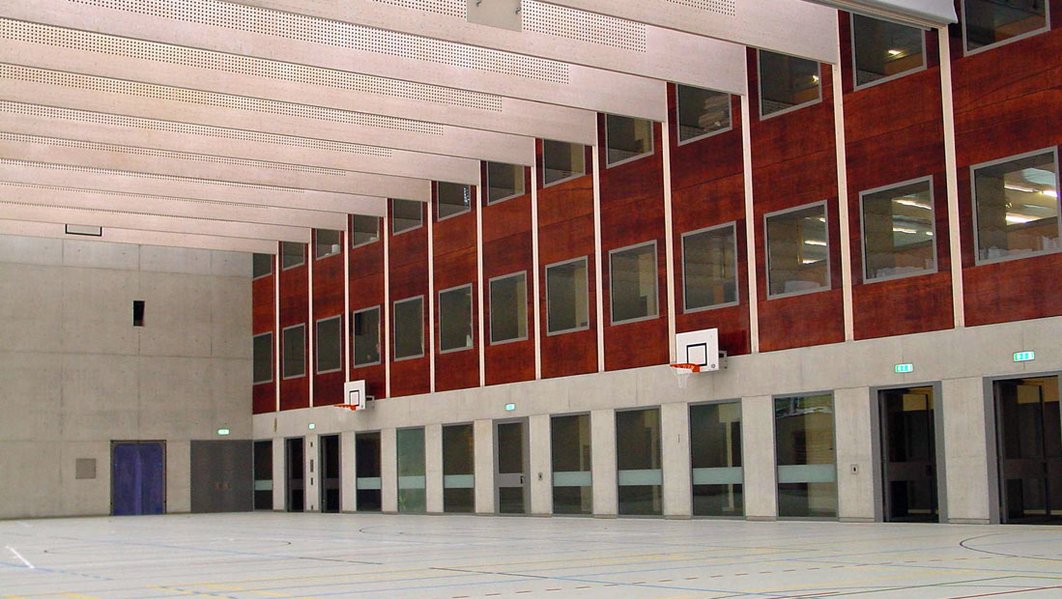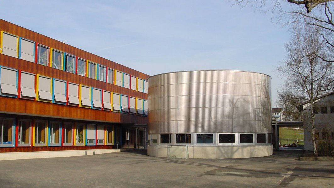 Dreigeschossiger, 87 m langer Klassentrakt mit nordseitig angedockter Turnhalle im Untergeschoss. Tragstruktur: vorgefertigte, tragende Wandelemente und Stützen; Decken aus vorgefertigten, vorgespannten Sichtbetonplatten mit Überbeton. Foyer, Singsaal und Decke Turnhalle in Ingenieurholzbau.